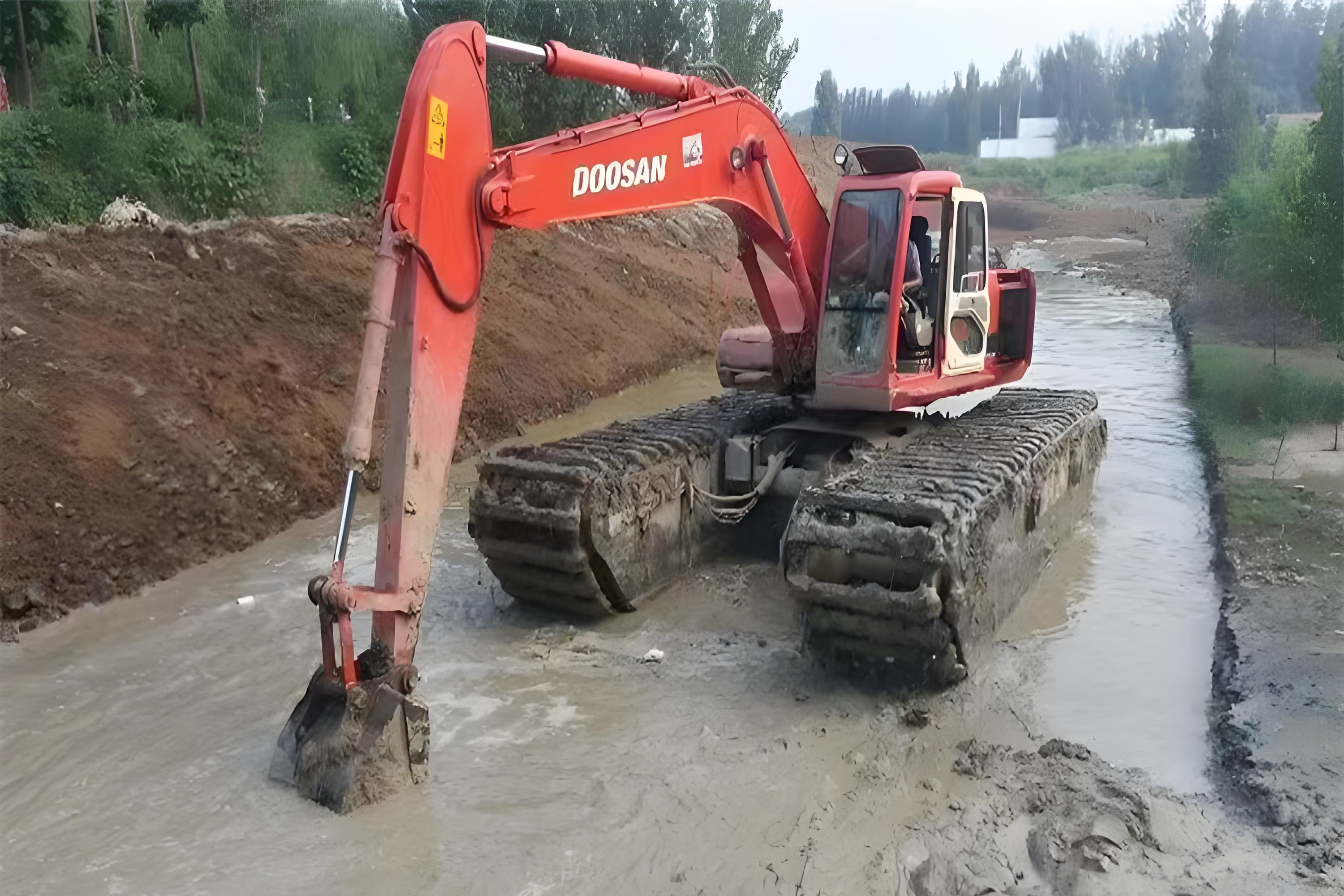 - 深水區(qū)(水深 1-3 米,比如濮陽(yáng)金堤河):給挖機(jī)裝浮箱,像 “船” 一樣在水上作業(yè)。